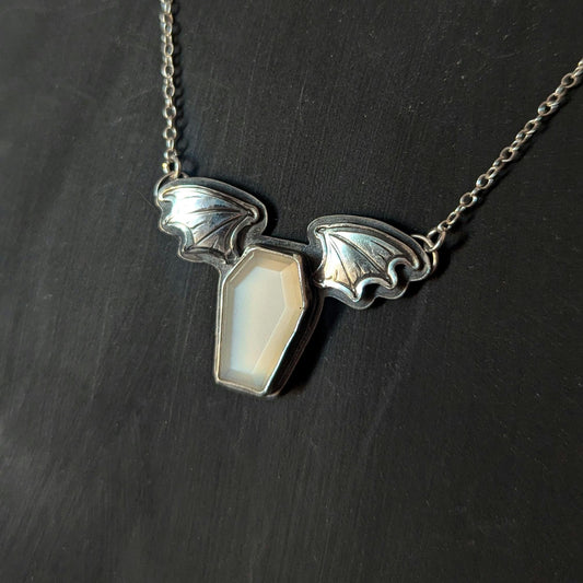 925 Sterling Silver Bat Wing White Moonstone Coffin Pendant Necklace - 18" Length