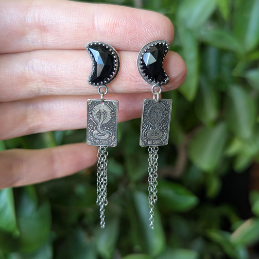 925 Sterling Silver Black Onyx Crescent Moon Snake Tarot Inspired Chain Tassel Dangle Earrings