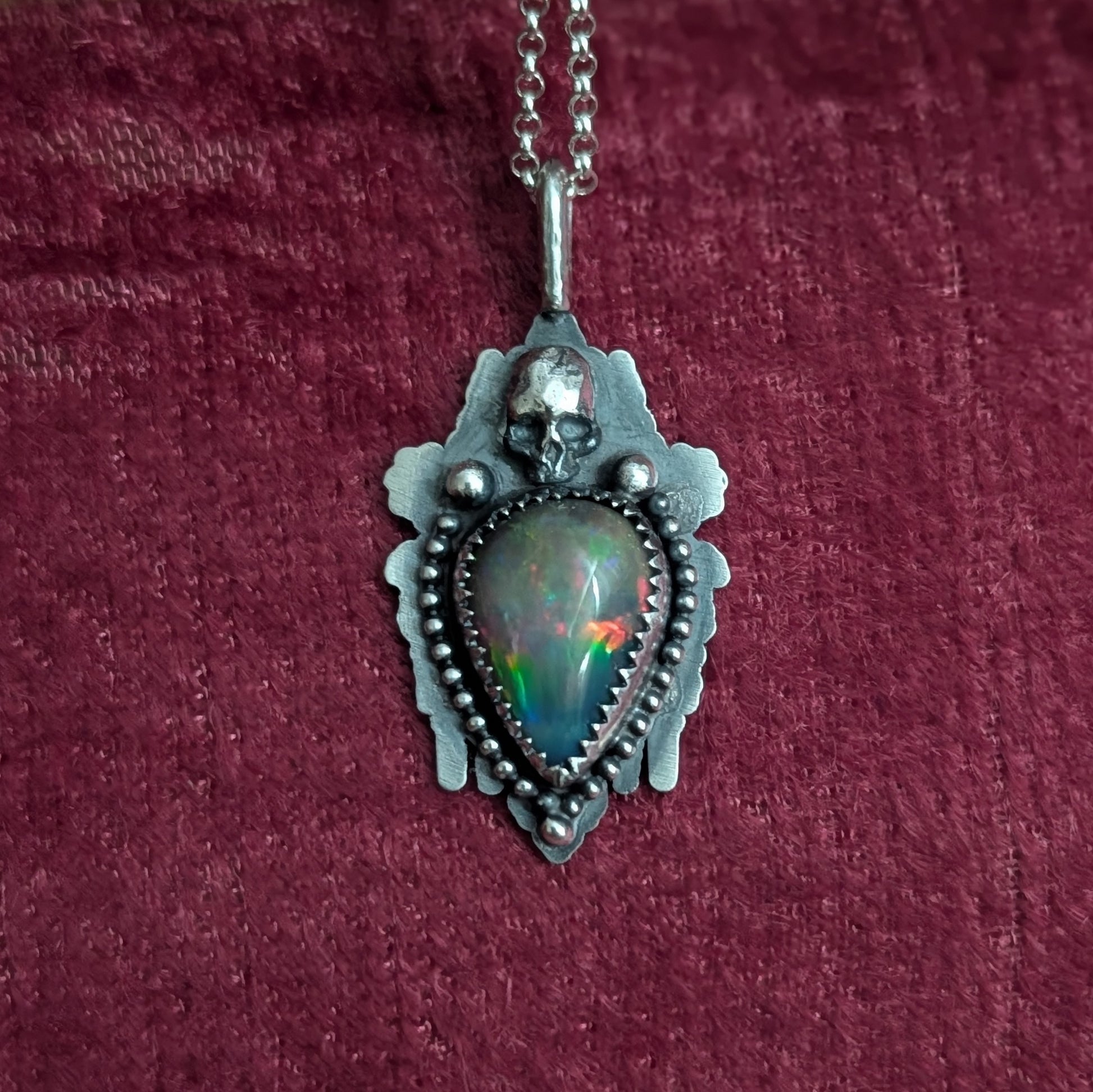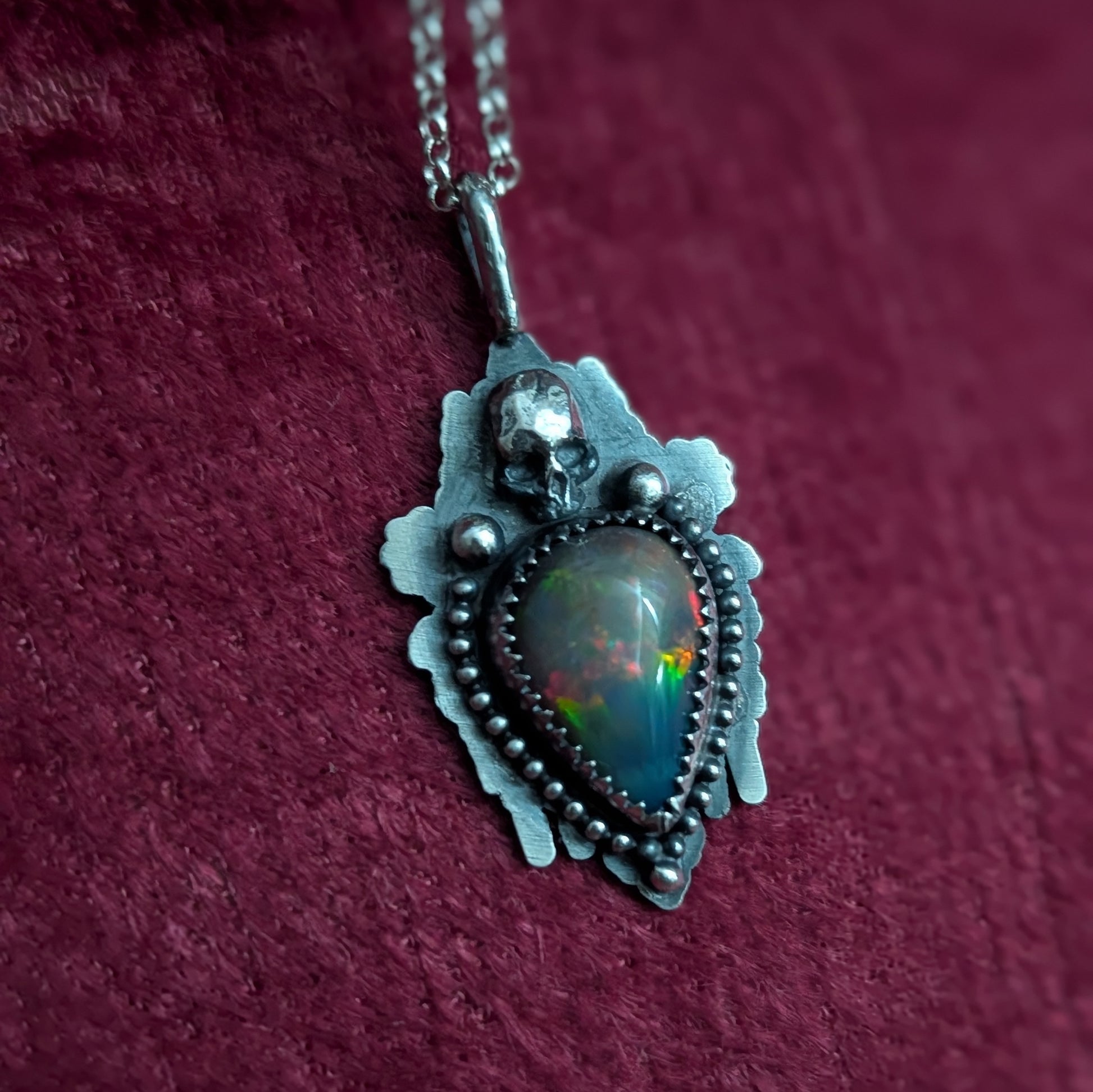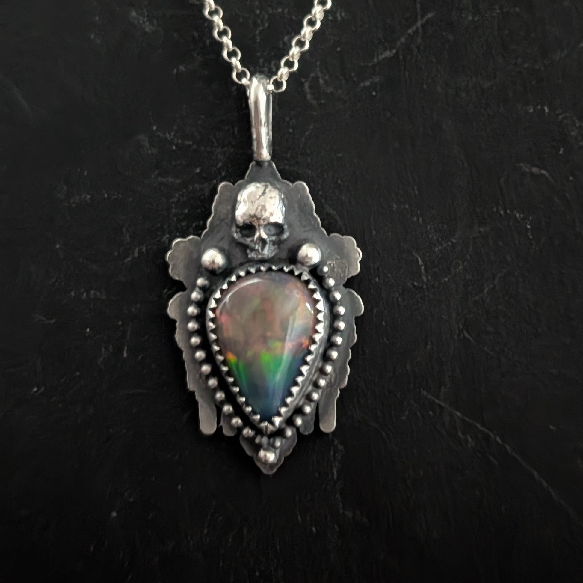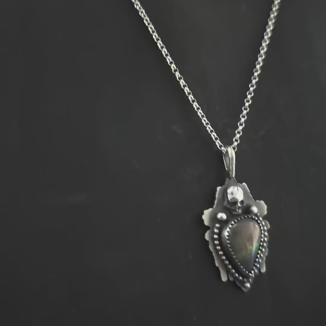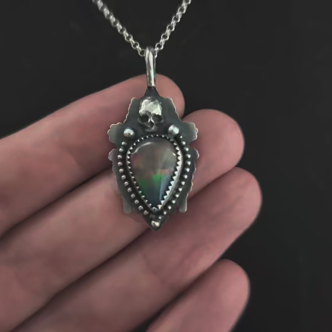 Crafted from sterling silver, it showcases a teardrop-shaped black opal cabochon (1/2" x 3/8") paired with a sinister sterling silver skull. The pendant’s back is engraved with a gothic mirror, adding a mysterious, witchy touch.