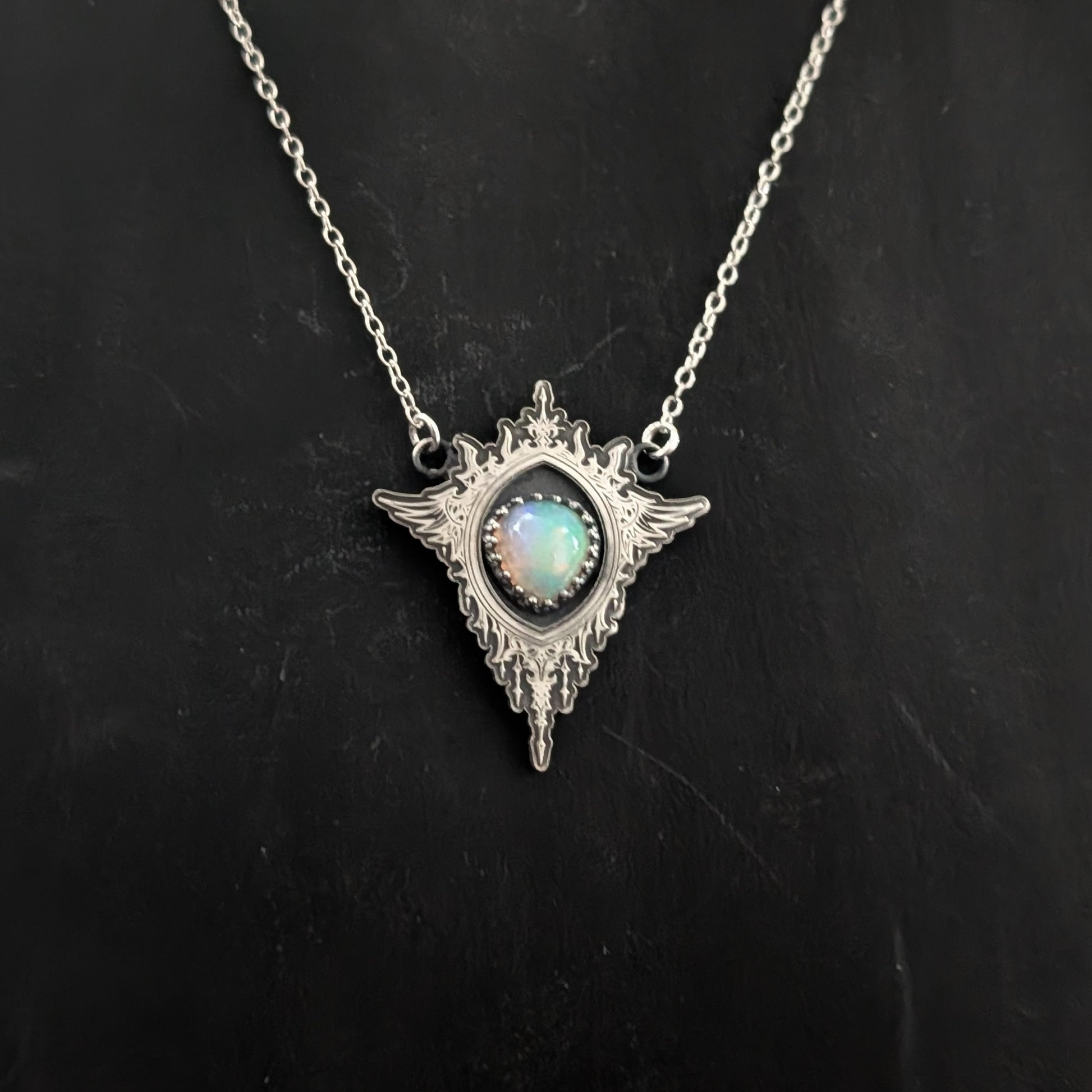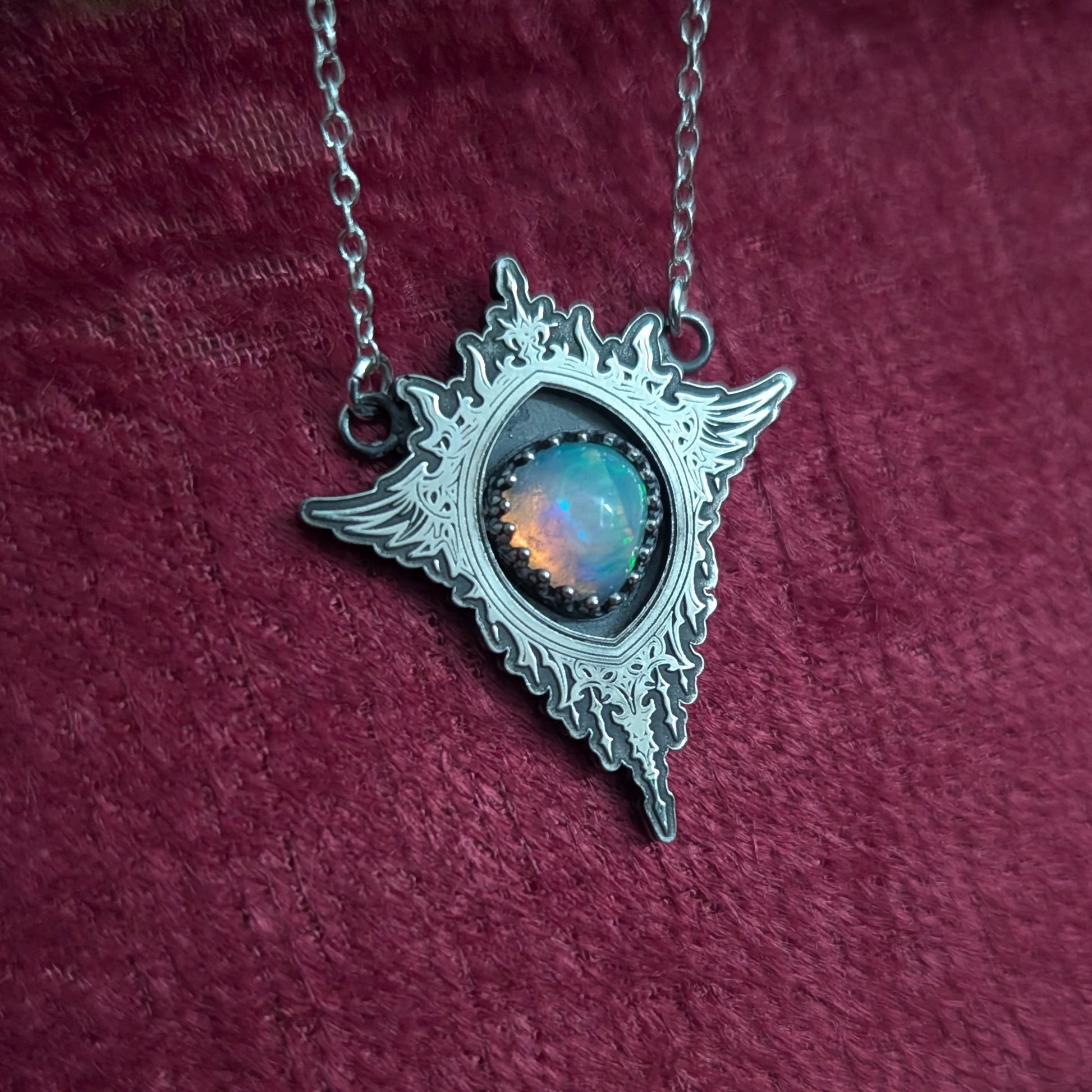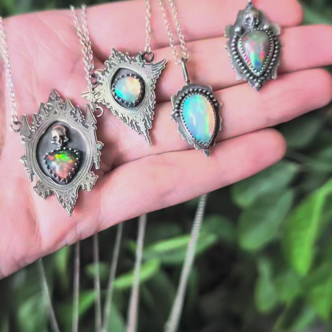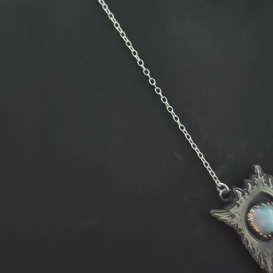 This striking Opal Gothic Mirror necklace radiates dark, ethereal allure.