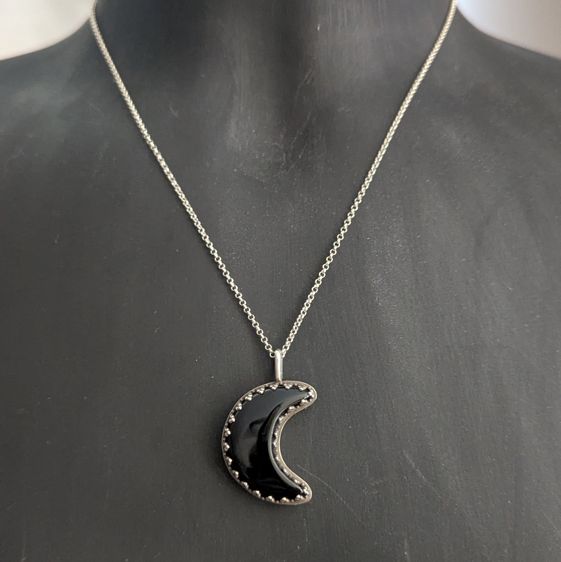 Crafted from sterling silver, this pendant showcases a captivating black obsidian crescent moon cabochon (1"x3/4"). The entire pendant, including its bail, stretches to a striking 1 3/8"x7/8".