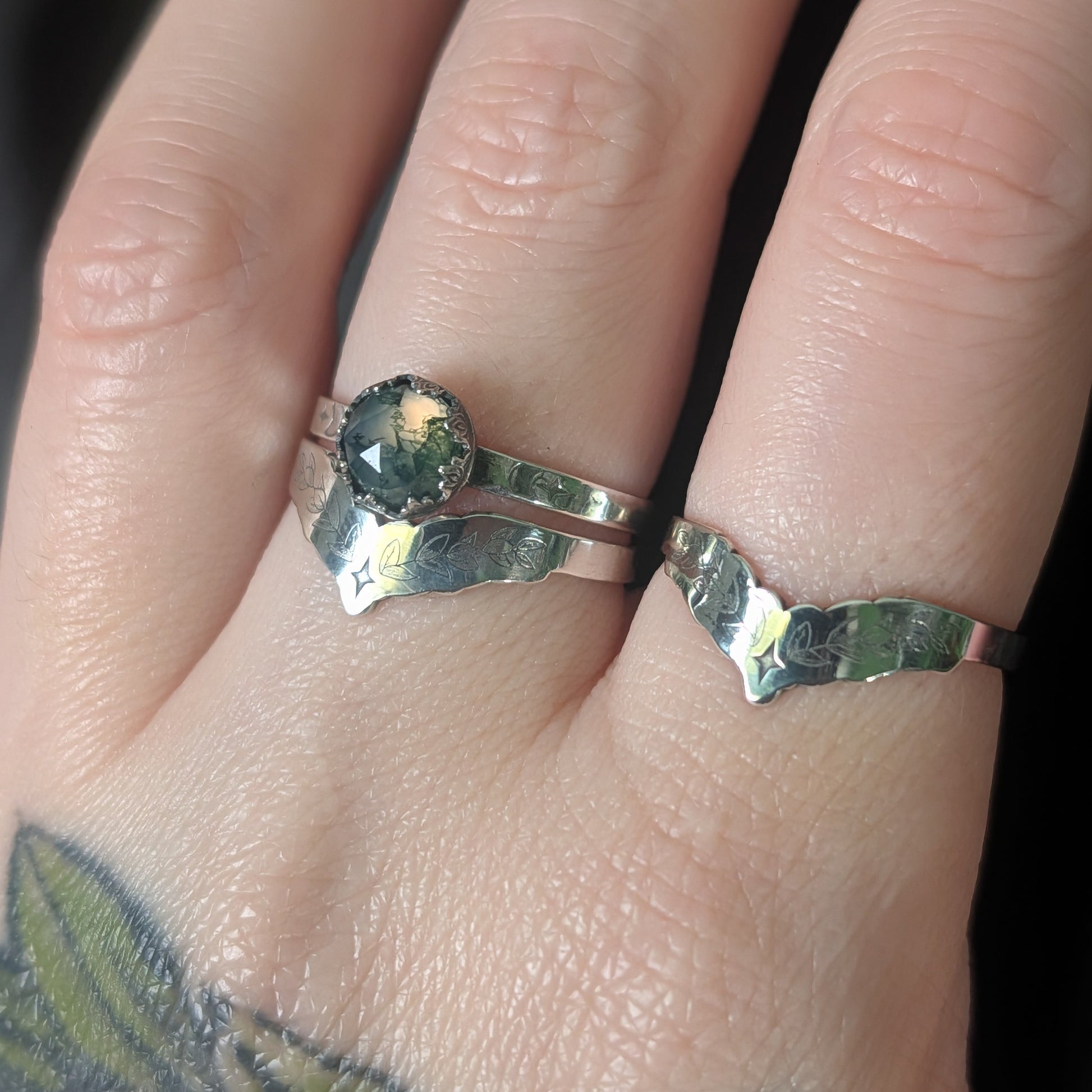 Not only can you choose your size, you can also choose the stone! You have the choice of a rhodolite Garnet, Moss Agate (which is featured in this listing) and black spinel. The cabochon measures 6mm (approximately 1/4").