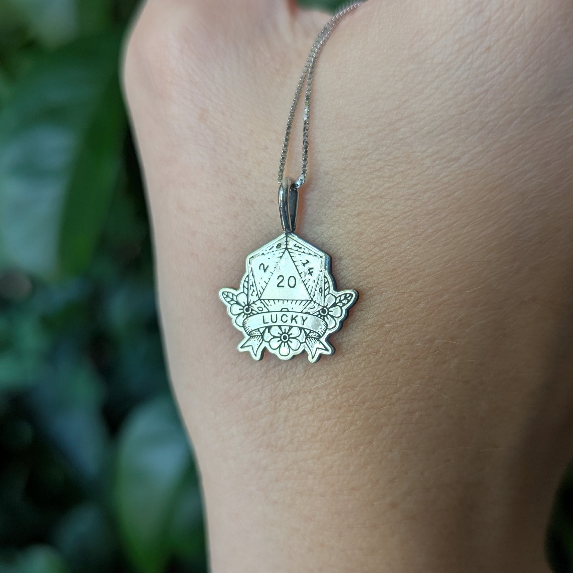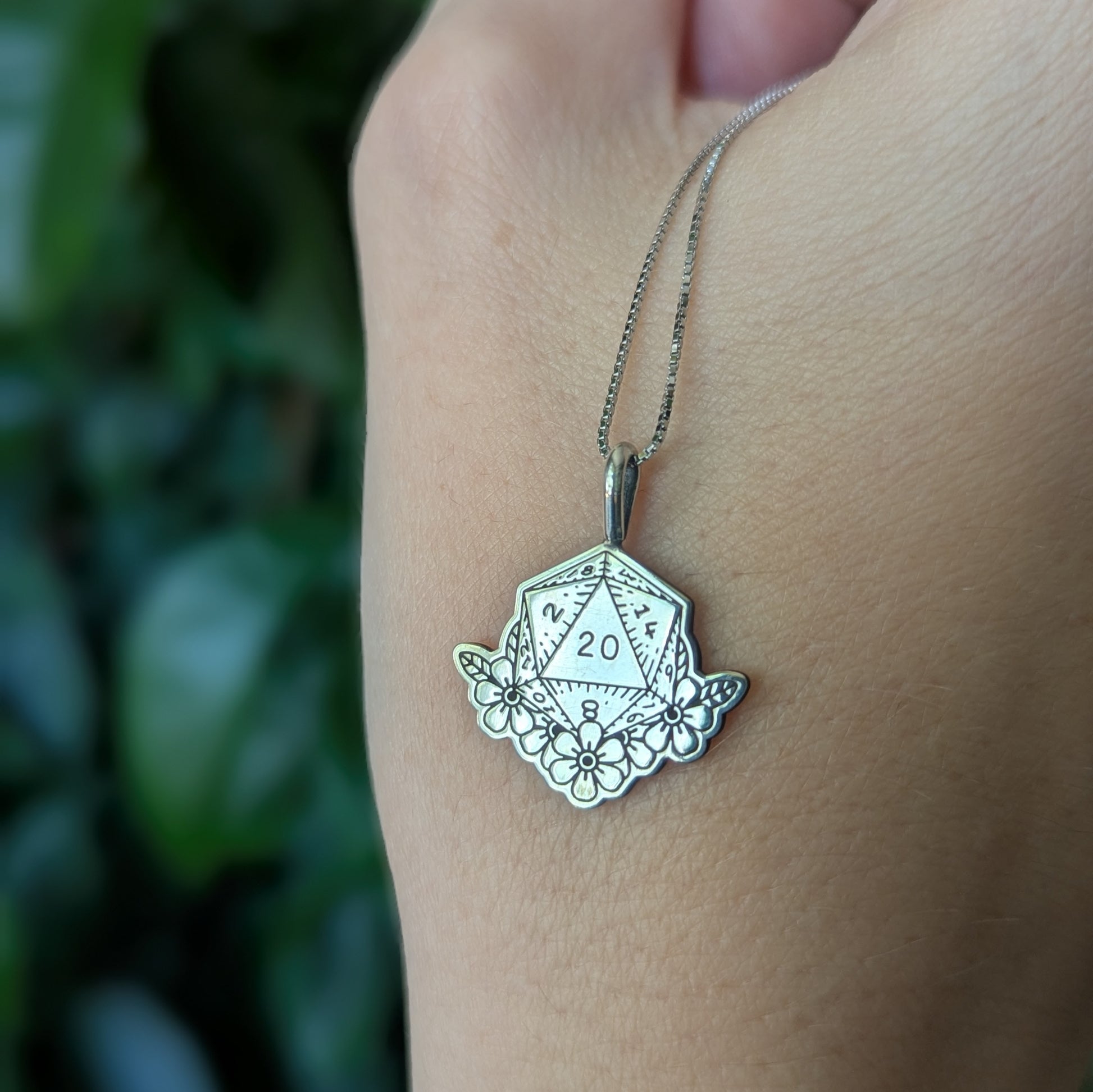 Made from sterling silver, these dice pendants are engraved with d20's - one of the most utilized of the polyhedral dice in the famous role-playing game.