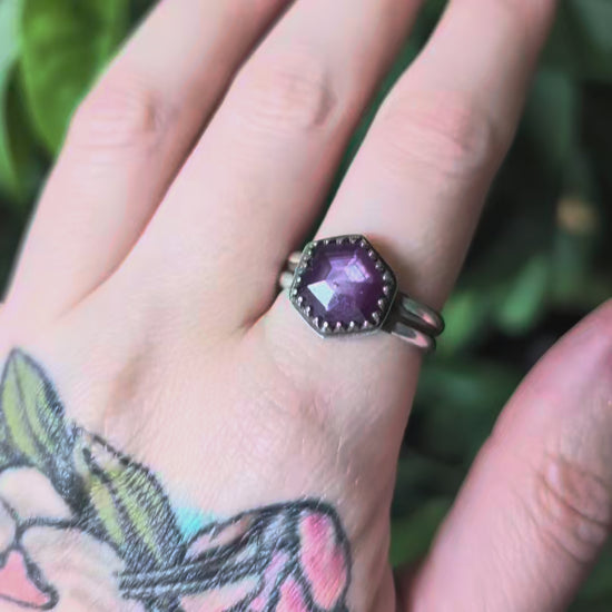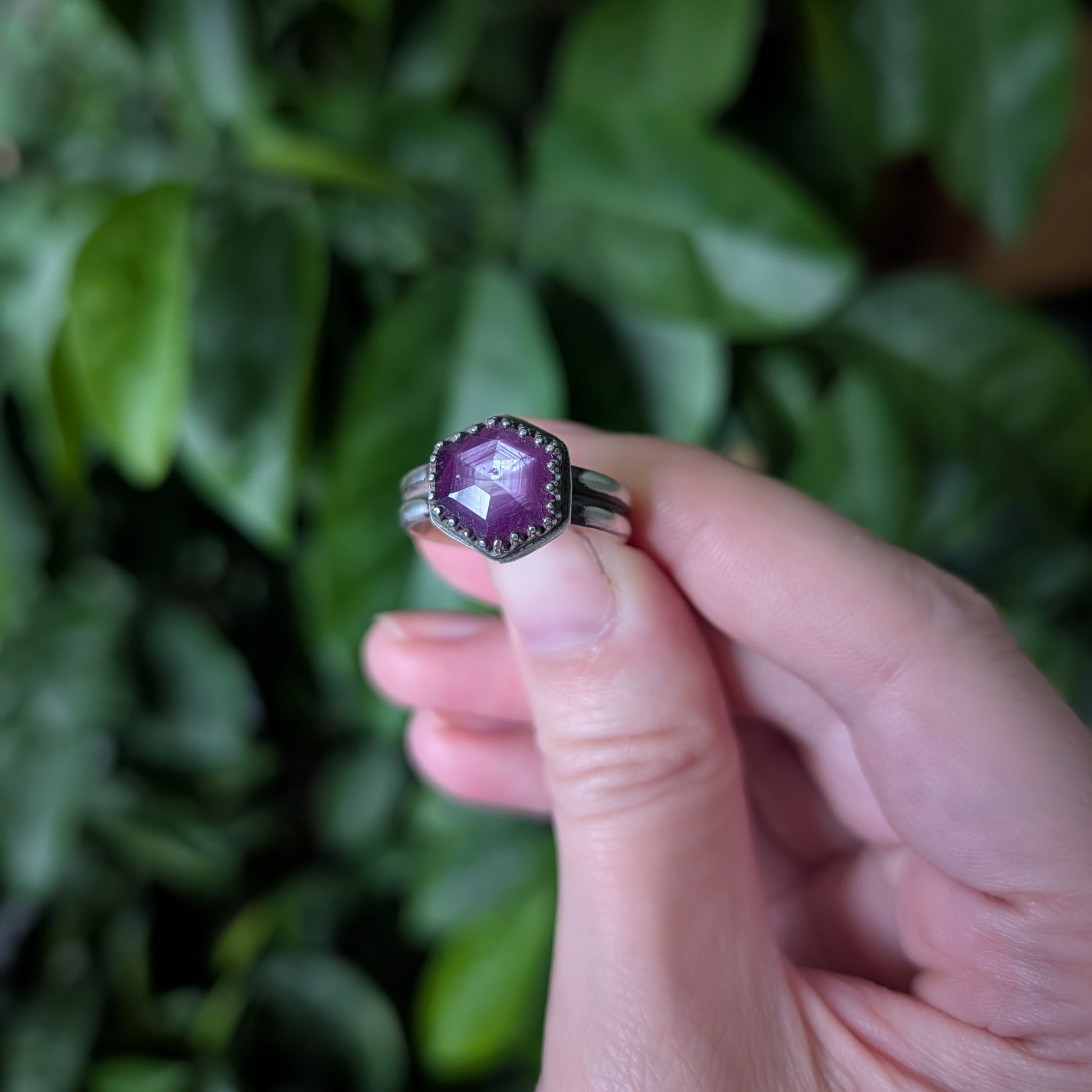 Made from sterling silver, this beauty features a beautiful hexagonal pink sapphire cabochon that measures 3/8"X3/8".