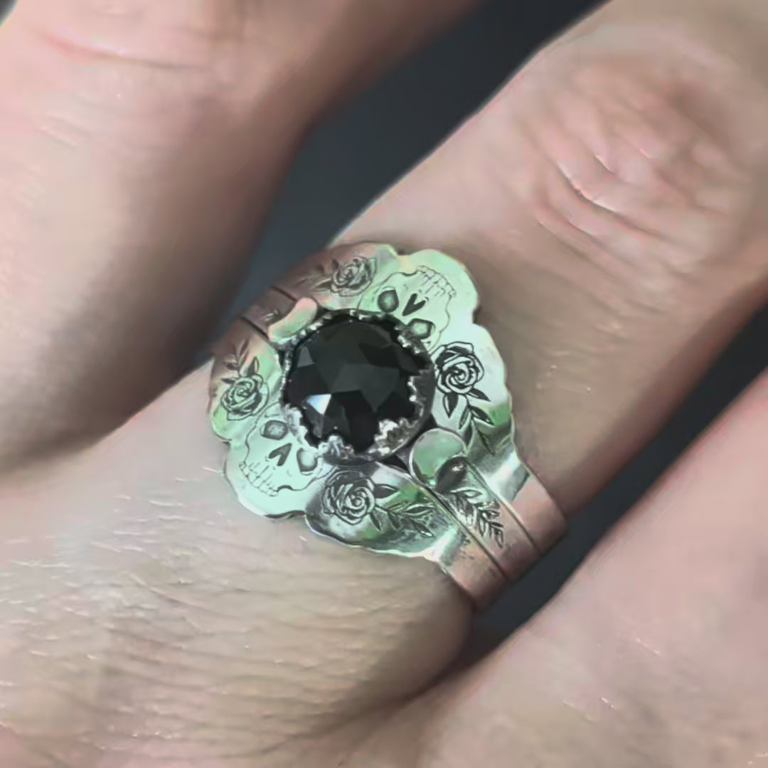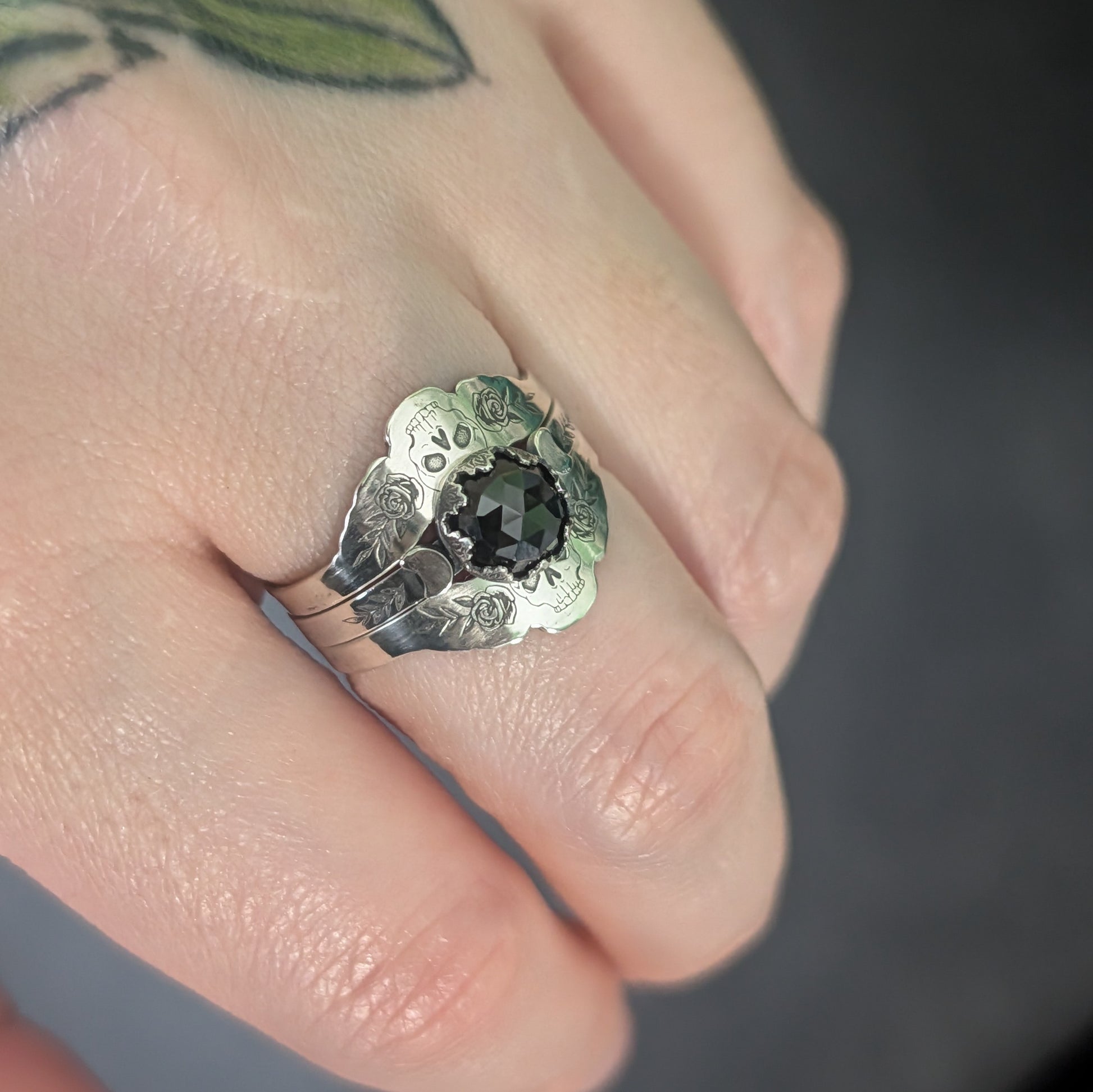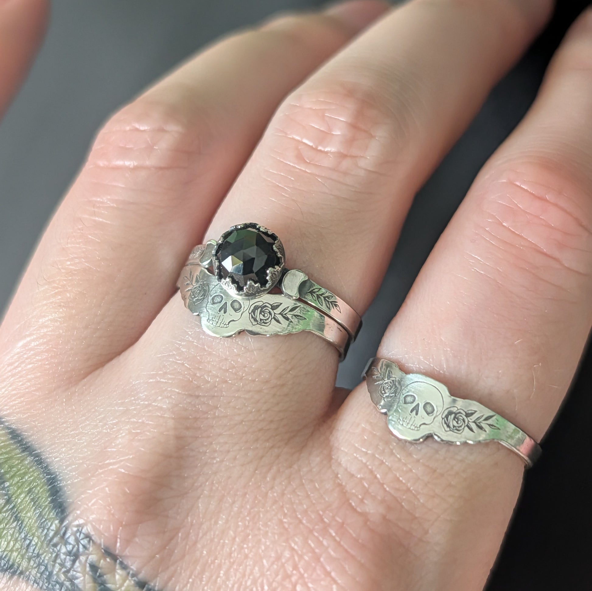 Made with sterling silver, this ring stack features a skull and rose design on the outer rings and two crescent moons on the middle ring! This ring set is beautiful and customizable - so easy to mix and match!